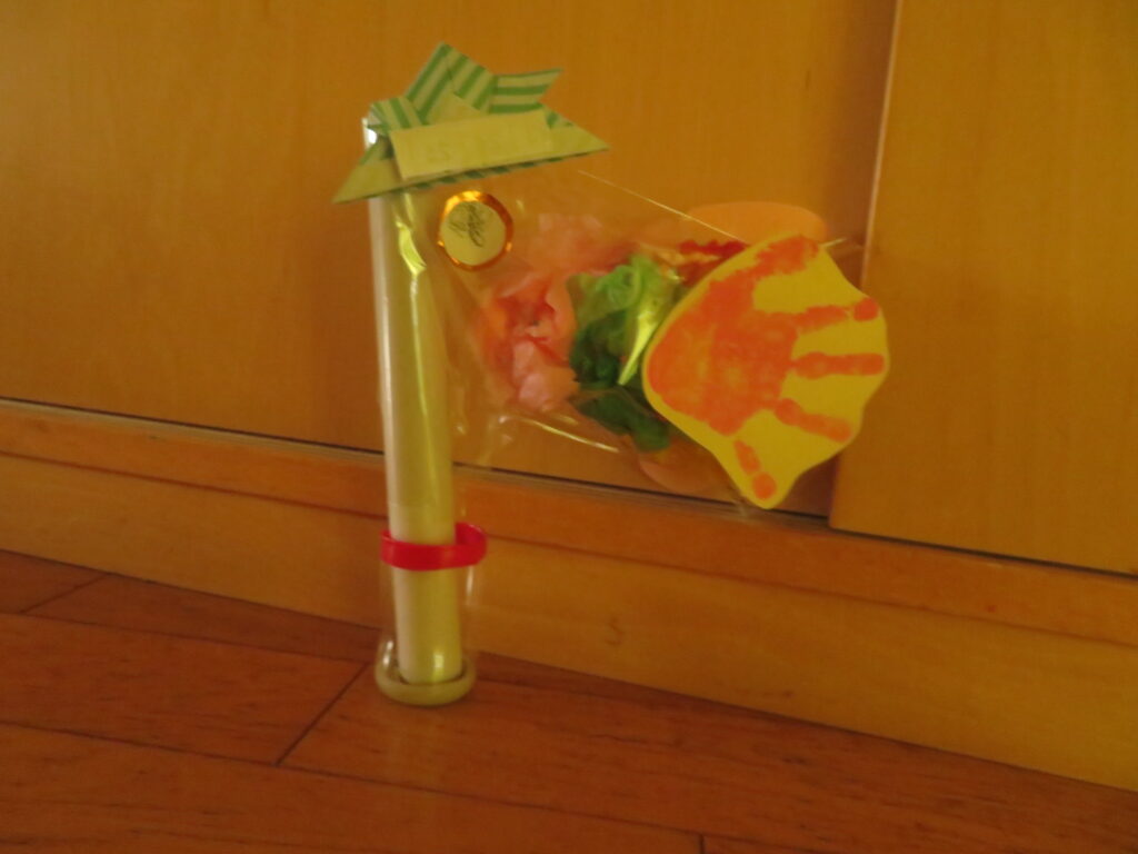 絵の具で、ぺったん!可愛い手型、(足型)とれました。絵の具が手に付くの嫌だったけど、ちょっと頑張ったらできたね!!